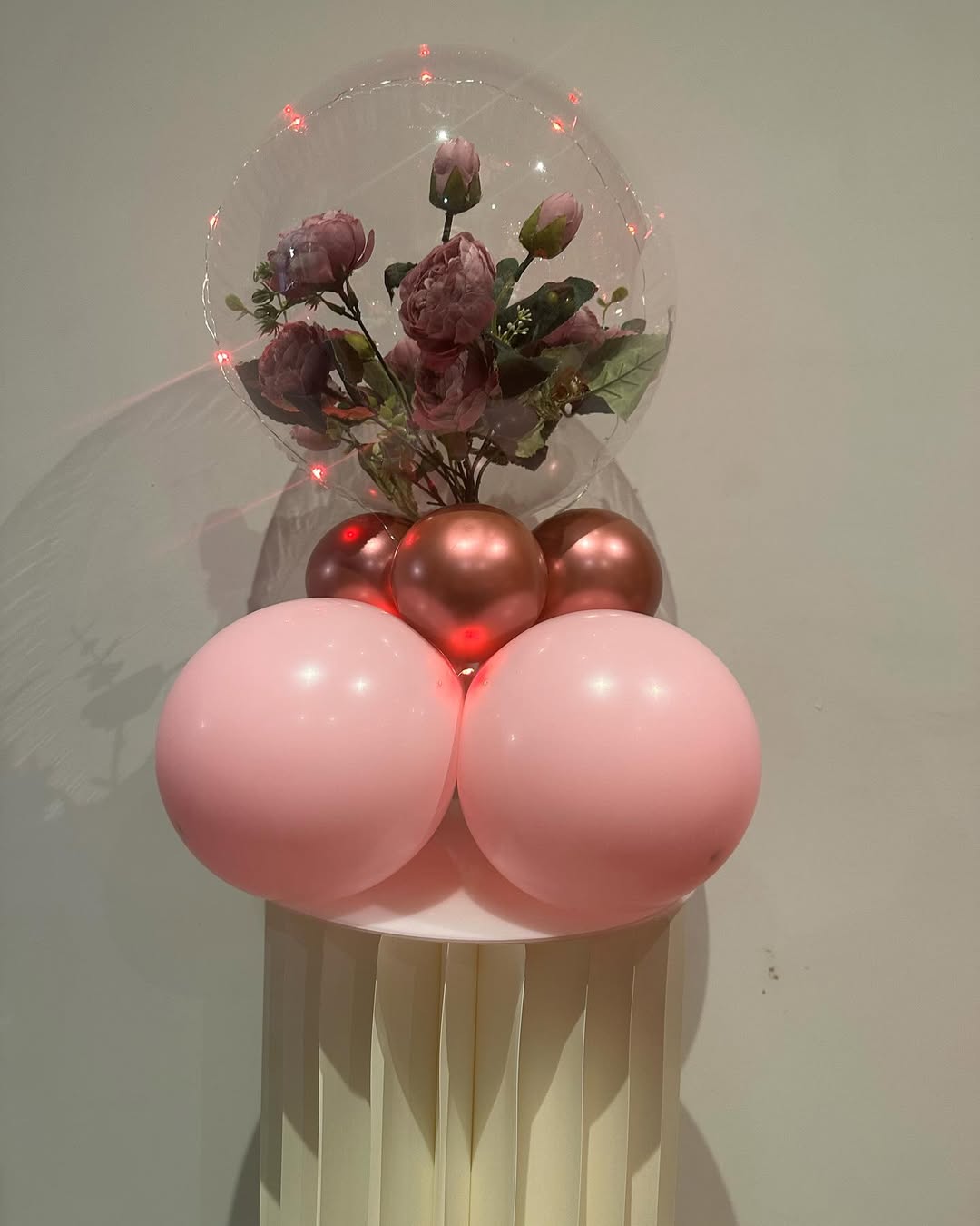 Elevate your gifting with this breathtaking floral balloon display. This piece features a crystal-clear “deco bubble” balloon that perfectly showcases a bouquet of realistic, deep-pink silk roses. To add a magical touch, the balloon is wrapped in a warm LED fairy light string that creates a soft, ambient glow. The entire arrangement sits atop a sophisticated base of metallic rose-gold and soft matte pink balloons, making it an elegant centerpiece or a high-end gift for birthdays, anniversaries, or “just because.”