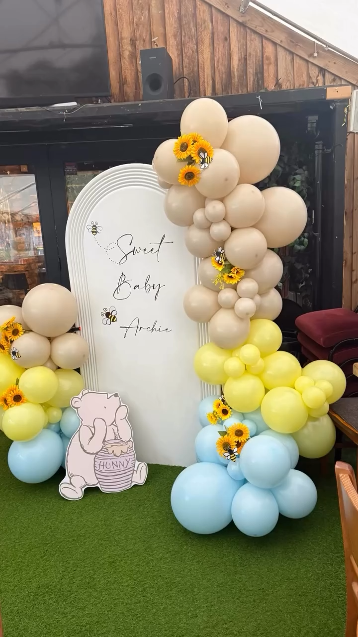 Celebrate the arrival of your new “hunny” with this enchanting Winnie the Pooh inspired backdrop from Helens Ballooniverse. This professional setup includes a custom-printed white arched sailboard—personalized with your baby’s name—flanked by cascading organic balloon arches in soft sand, butter yellow, and sky blue. The display is brought to life with delicate silk sunflowers and honeybee details, finished with a classic “Pooh Bear” character cutout. It’s a timeless, gender-neutral choice for baby showers and first birthdays that creates a perfect setting for family photos.