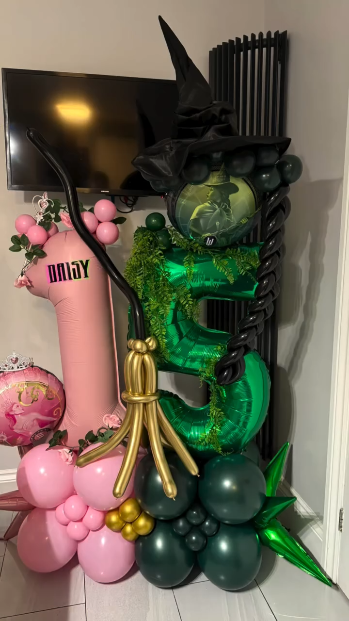 Defy gravity with this stunning character-themed birthday stack! Perfect for fans of the “Wicked” musical and movie, this display features a large metallic green number 5 entwined with ivy and topped with a specialized Elphaba foil balloon and a classic witch’s hat. The design includes a golden balloon broomstick and a contrasting pink side-stack personalized with the name “Daisy,” representing the iconic Glinda/Elphaba duo. It’s a theatrical, high-detail piece that makes for a spectacular birthday surprise.